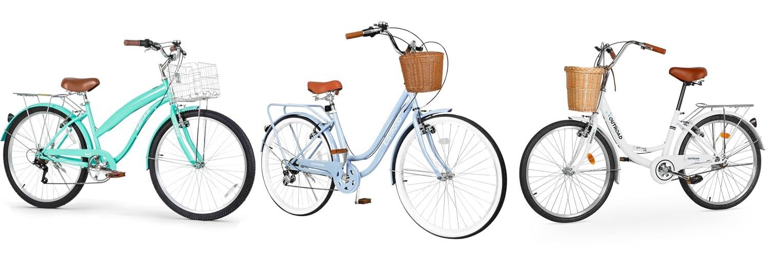 The Outroad Beach Cruiser Bike is a 24-inch commuter bicycle designed for adults. It is made for both men and women. This bike has a high-carbon steel frame. It promises a comfortable ride around the city. It comes in white and has options for a rear rack or basket. This bike is ready for smooth rides and easy commutes.