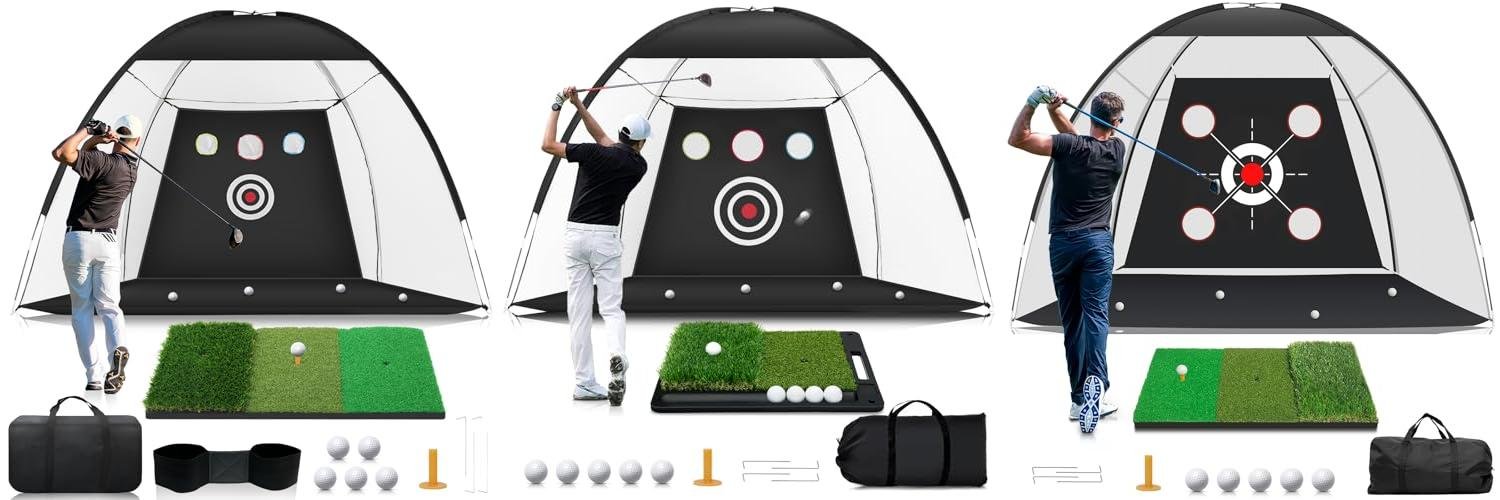 The KLAODOT Golf Net is a great tool for golfers. It’s a 10x7ft net designed to help you practice your swing. It comes with a practice mat, target pockets, and golf balls. This set is perfect for beginners and experienced golfers. You can use it indoors or outdoors to improve your game. It is a great gift for any golfer.