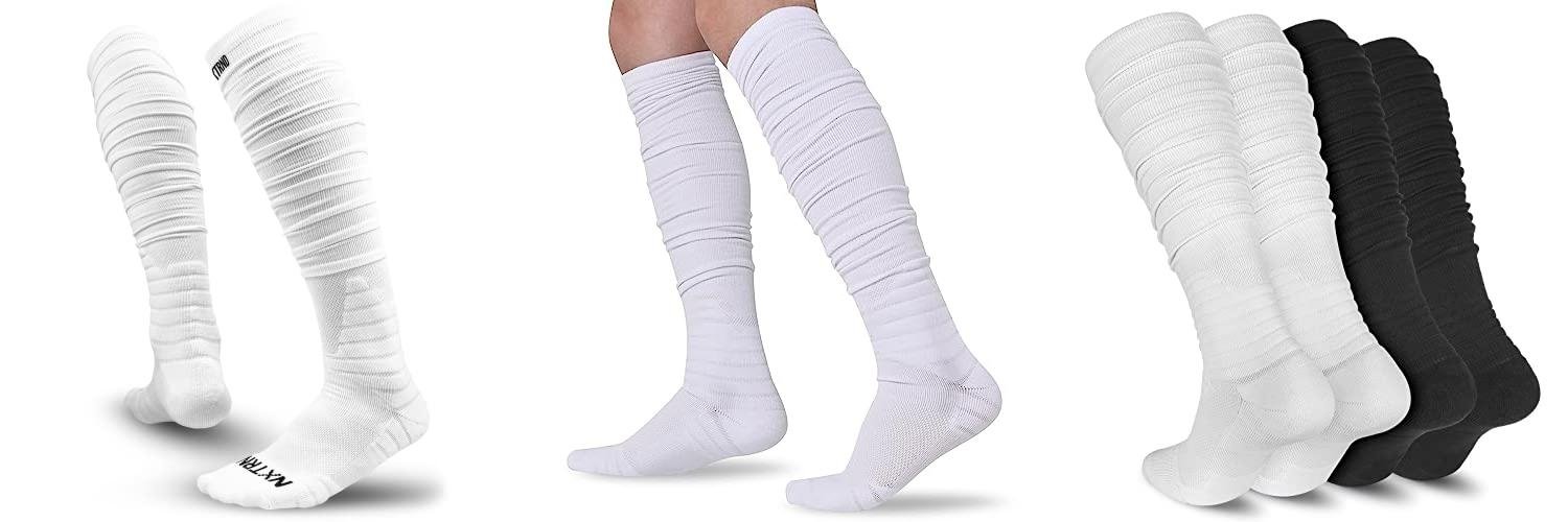 The Nxtrnd XTD Scrunch Football Socks are made for athletes. These extra-long, padded sport socks are perfect for men and boys. They come in white and a range of sizes. These socks are designed to help you perform your best in sports like football, soccer, and baseball. They are made to meet the rules of high school and college games.