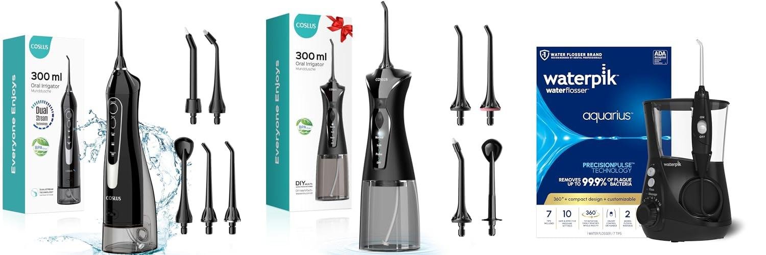 The COSLUS Water Dental Flosser is a portable and cordless oral irrigator. It’s designed to make your teeth cleaning easier and more effective. This electric flossing machine uses water to clean your teeth. It removes plaque and improves gum health. It is also great for preventing bad breath and cavities. It’s perfect for home and travel use.